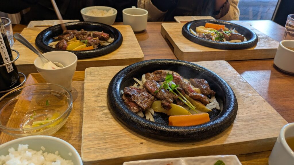 配偶者と娘はランプ肉のセット。自分はランチセットメニューにある和風なんとかセット。写っていないが大根おろしとかがセットされている。
