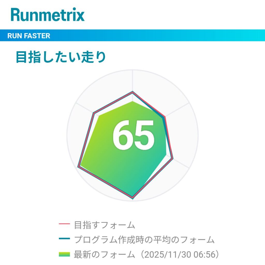 20kmぐらいから少し脚に来たが心拍数も有酸素域でまったり走れた。ランニングフォームは腰高い意識してと言われるがイマイチわかない。キロ4分台だと70点代なのでとりあえずヨシとする。