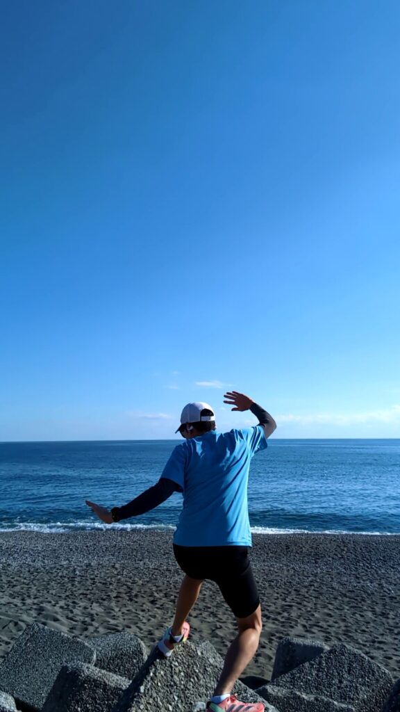 12km・・他のジョガーも頑張ってるな。砂浜でビーチフラッグしてる学生も楽しそう