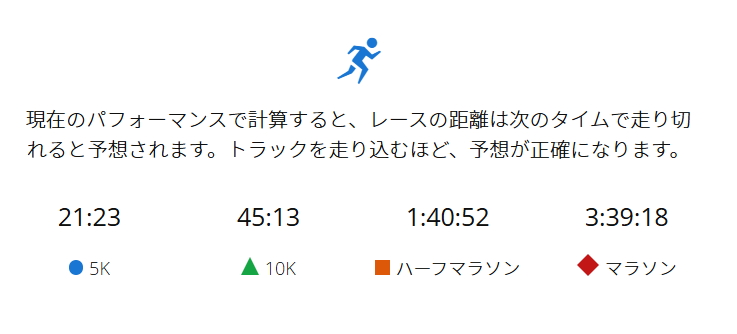 ガーミンさんの最新予想タイムは3;39分ですか。(そんな速度で走れる気がまったくしないし、あてにしてない)