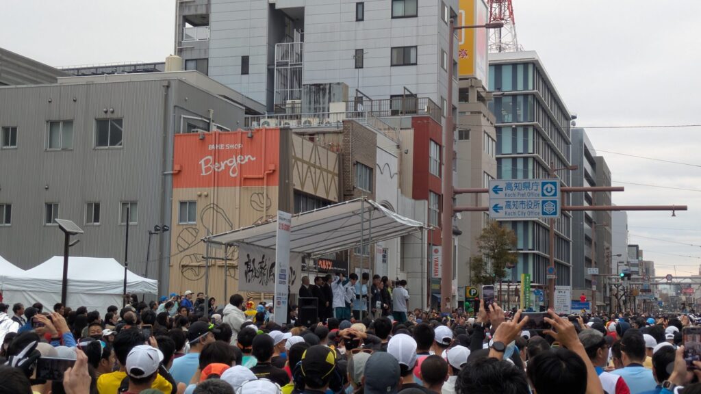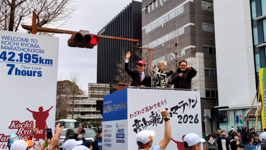 高知県知事と瀬古さん・インフルエンサーの志村さんの見送り。スタートラインまで約1分ぐらいだった。