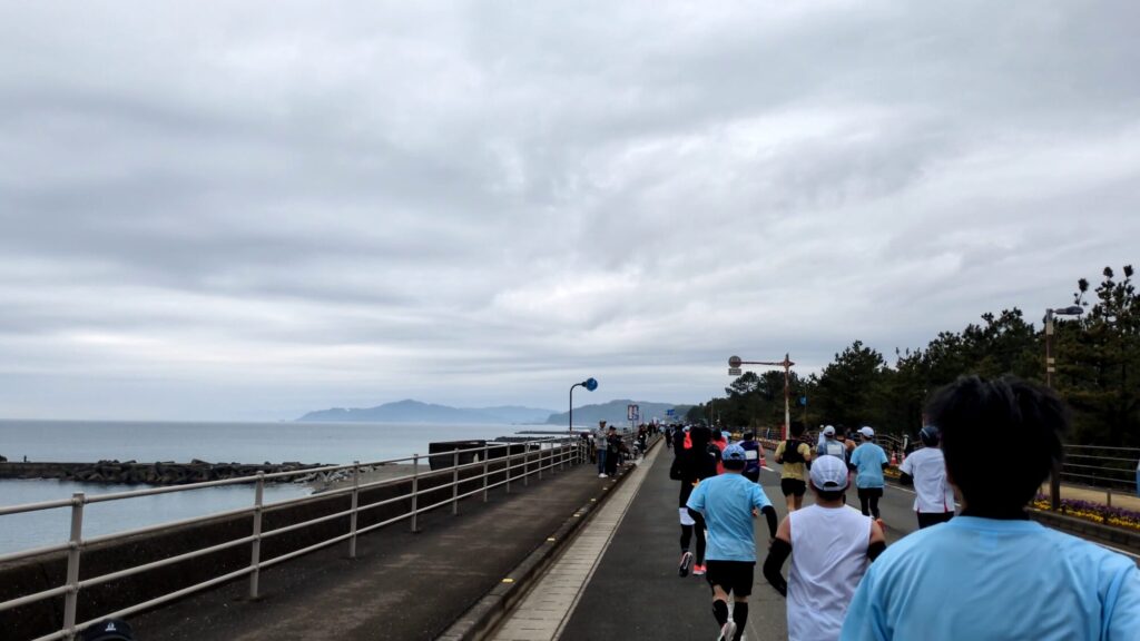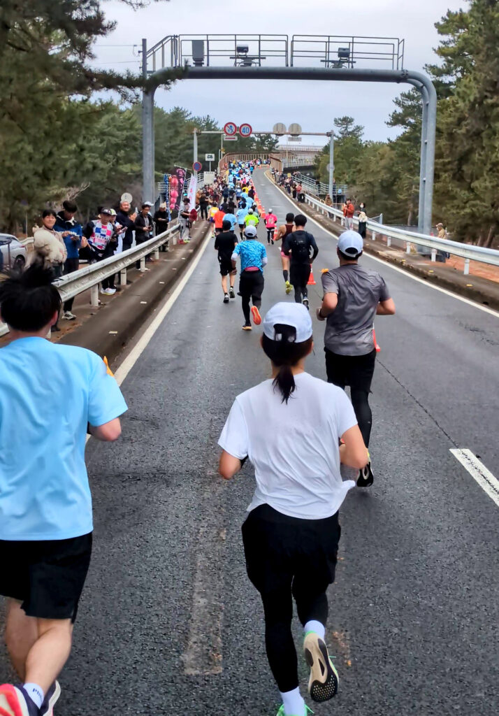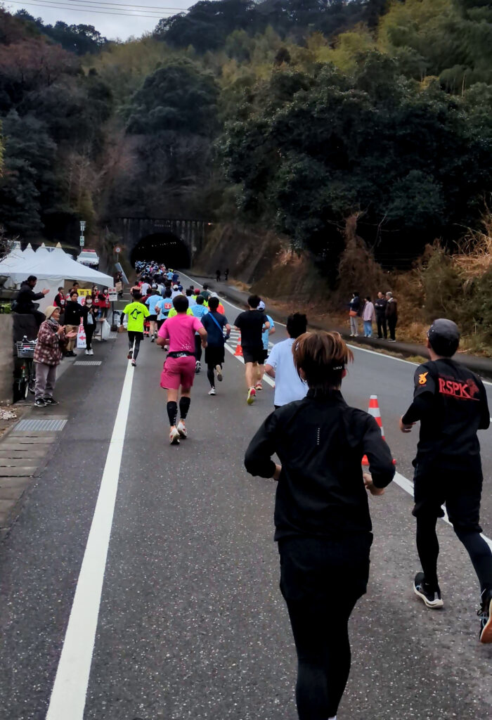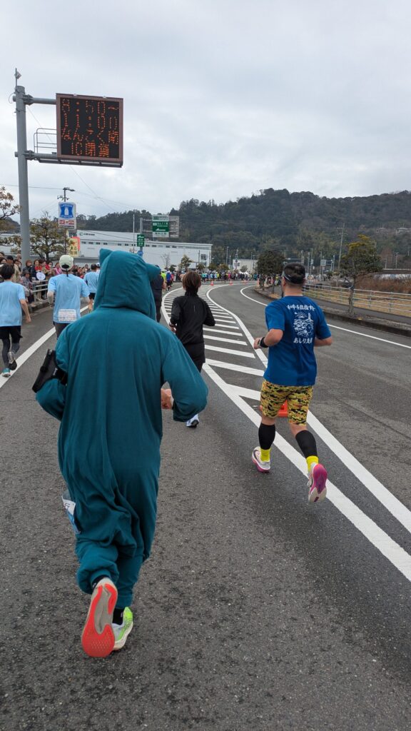 仁淀河口大橋でインフルエンサーの志村さんにぶち抜かれ(余りに早すぎて撮る余裕ゼロ)、渡り切ったあたりでサブ3.5のペーサーを務める青学の黒田(山神)さんとすれ違う。(笑顔で談笑してた)