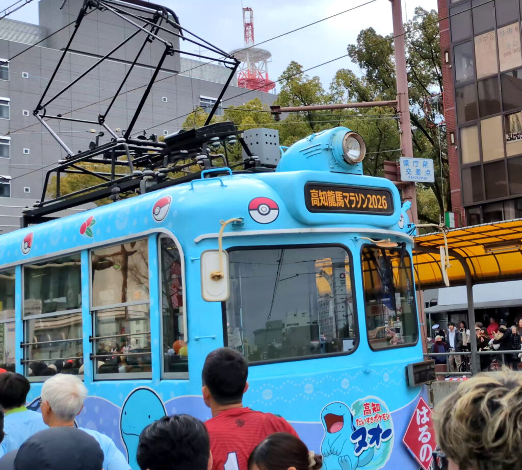 開会式前に鎮座してるポケモン ヌオーのラッピング路面電車。